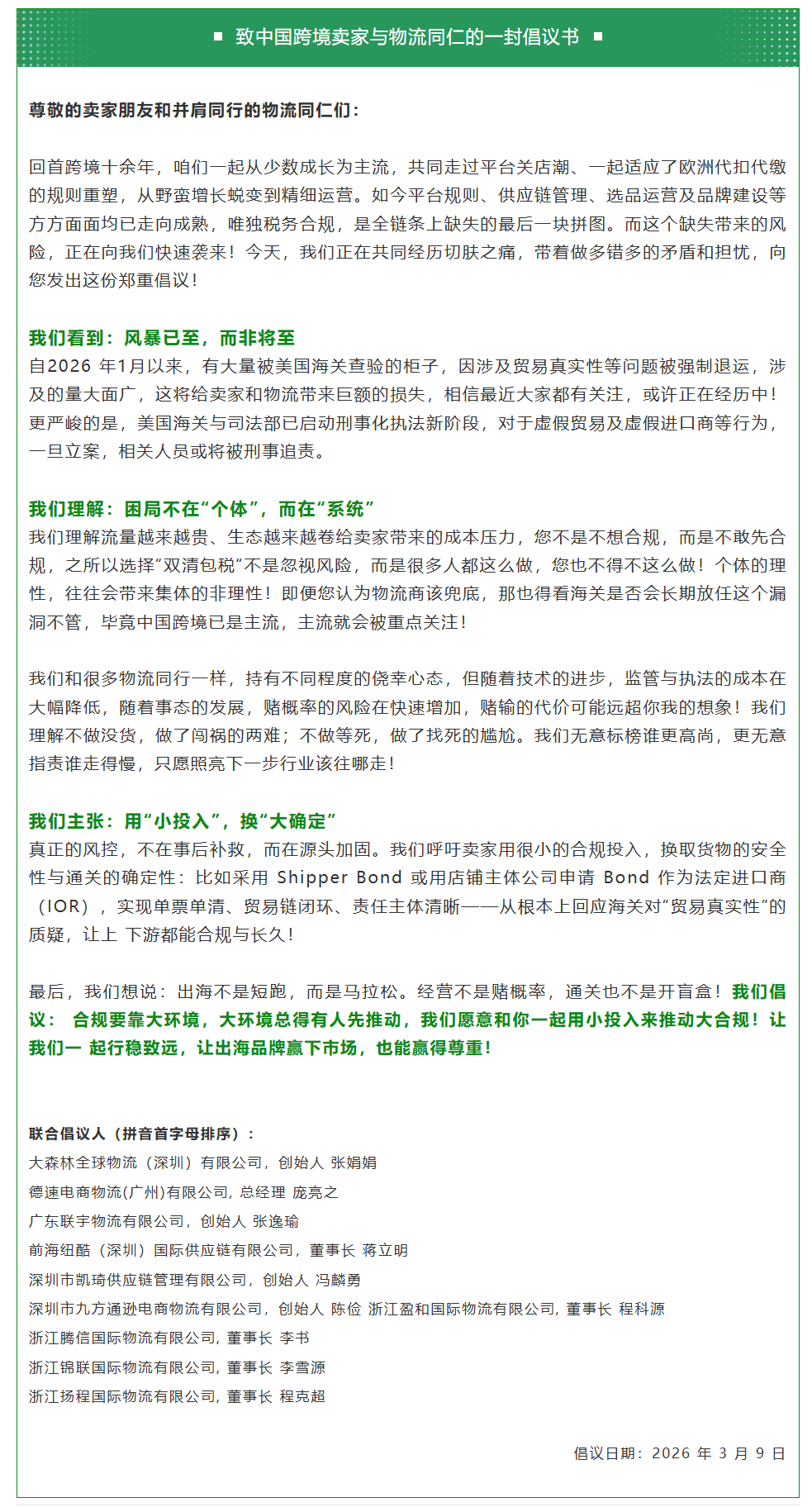 部分头部跨境物流商发起”致中国跨境卖家与物流同仁的一封倡议书!”