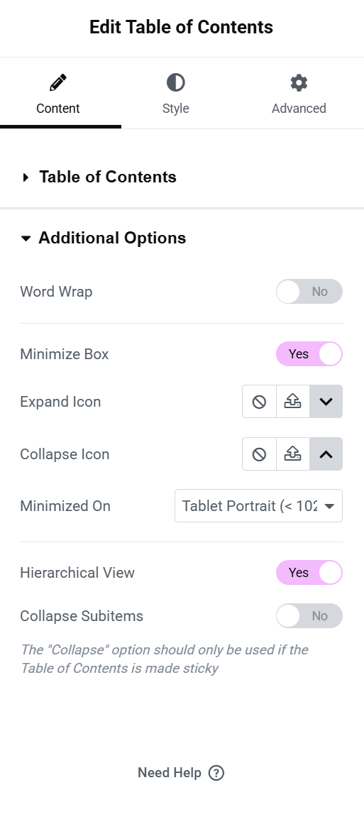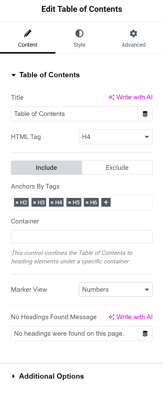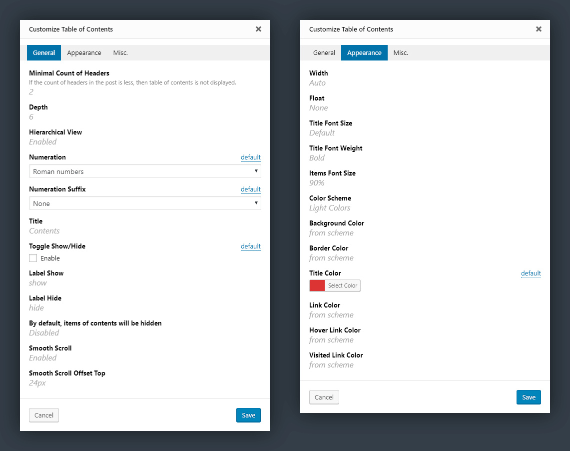 最小标题数,目录的深度,是否展示层级样式,层级使用数字还是不用,是否设置隐藏,目录点击后的滚动效果及位置